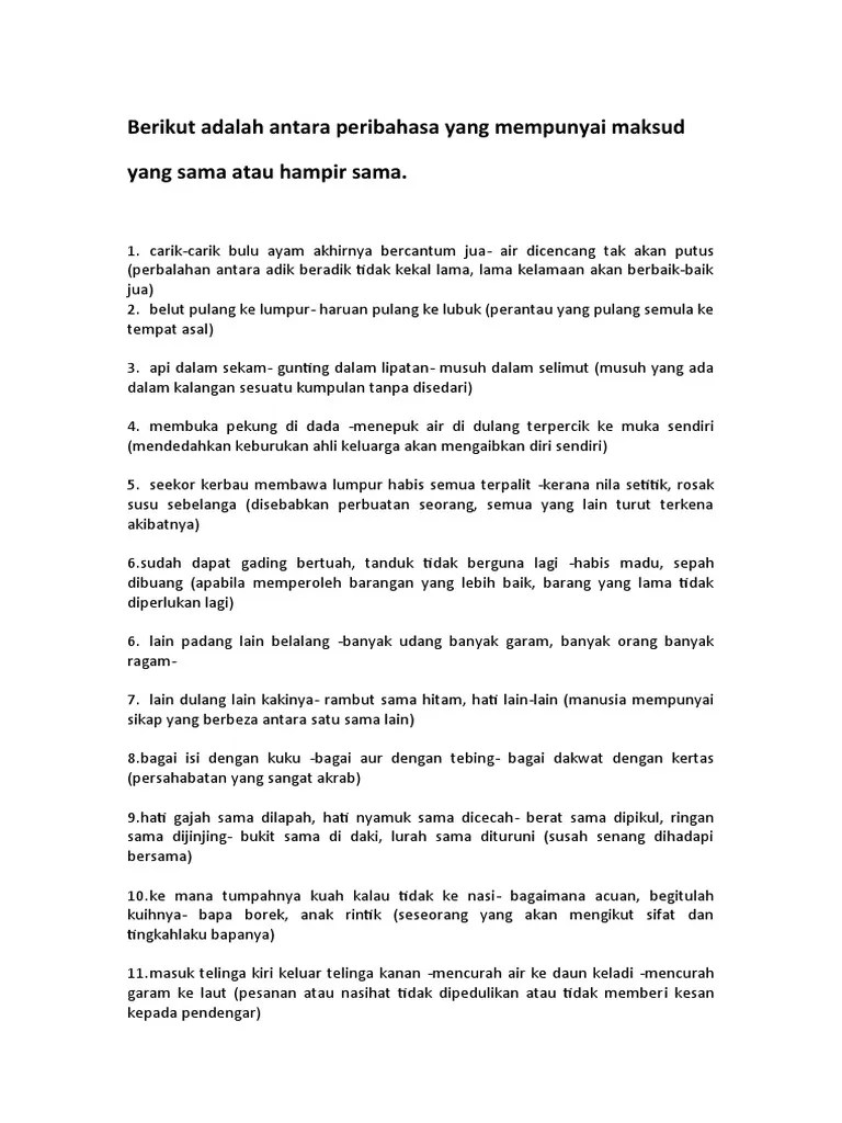 Peribahasa yang terakam dalam buku kamus istimewa peribahasa melayu ialah melentur biarlah waktu rebung. Melentur buluh biarlah dari rebungnya. Kalau takut dilambung ombak jangan berumah di tepi pantai maksud. Tindakan yang tidak sesuai dengan maksudnya tidak seperti yang diharapkan. Mendidik anak biarlah sejak mereka kecil lagi. As the twig is bent, . Bunyi jatuh yang kuat contoh ayat.